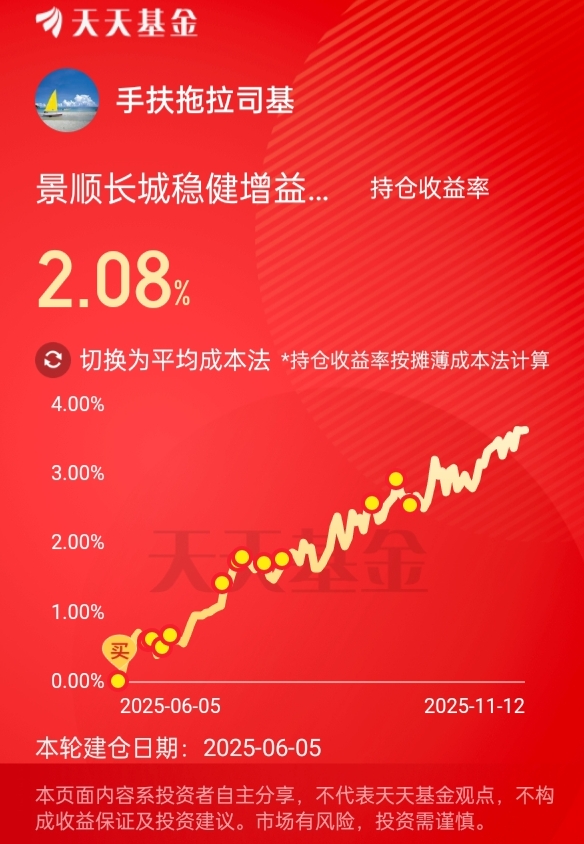 景顺长城稳健增益昨天收1蛋,今天预估收12蛋,表现很不错,一直保持稳健走势!这种震荡行情,偏稳健的固收+体验的确更好些,司机会继续拿着。