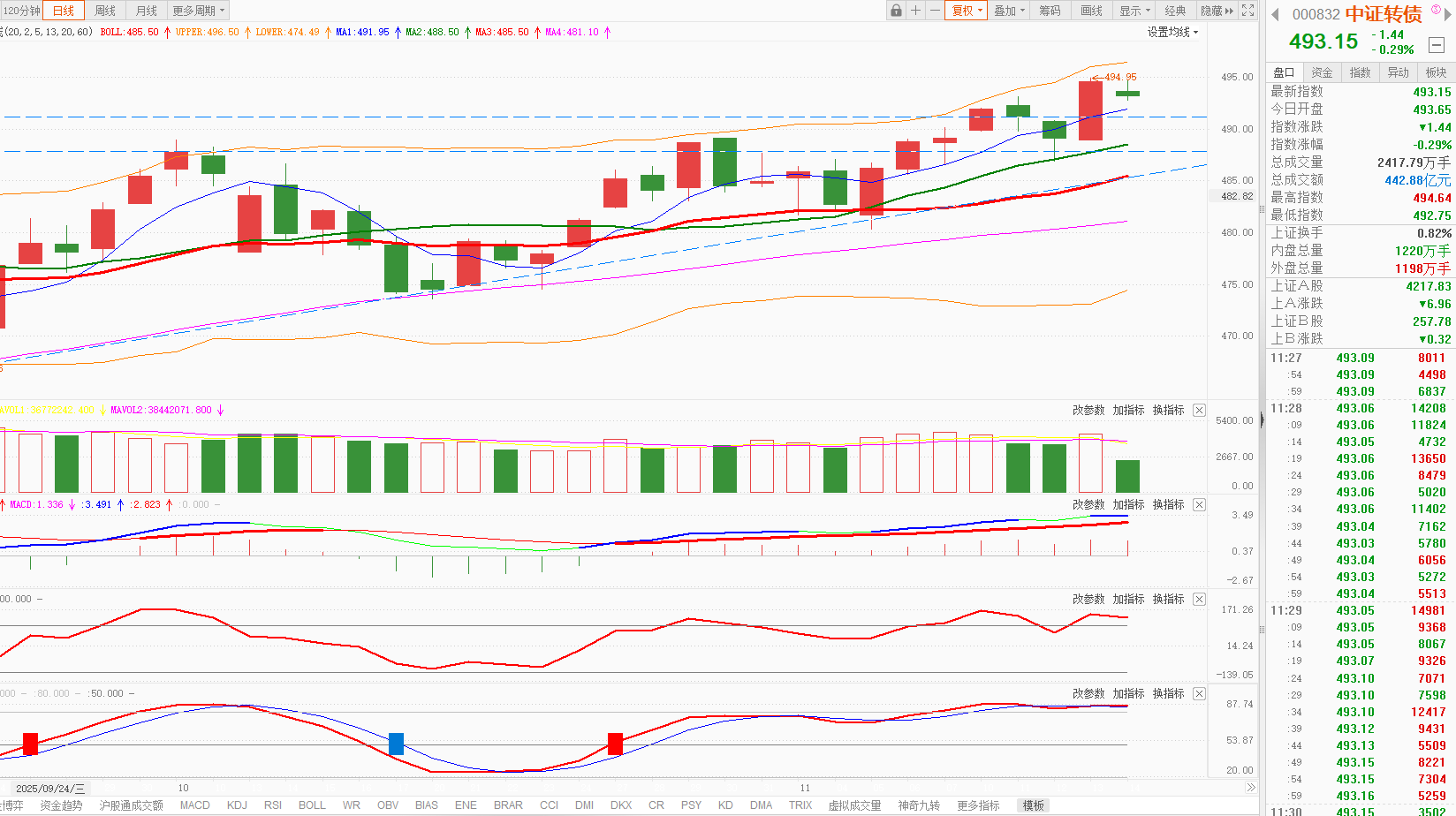 中期票据指数曲线小幅上升,日K线在5日均线之上,上升走势。