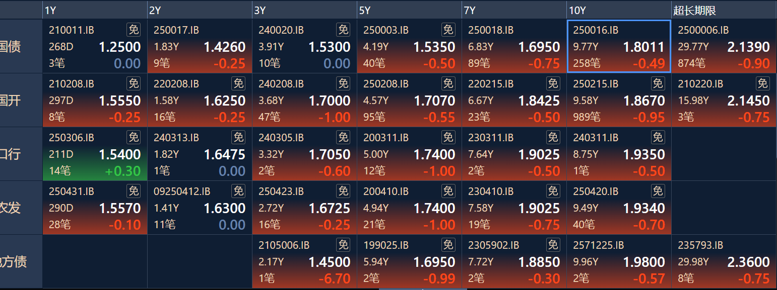 二、十年期国债收益率:1.8011 -0.0049%(国债收益率越涨,债市越跌,两者反向关系)
