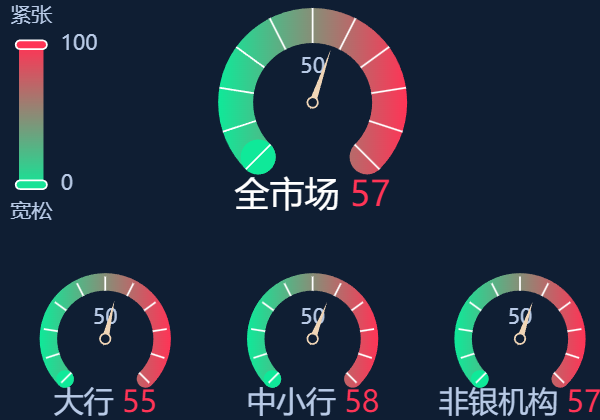 六、资金面情绪指数:全市场57 资金面趋紧 (0-100紧张度递增,50为均衡,超过50反映资金紧张)
