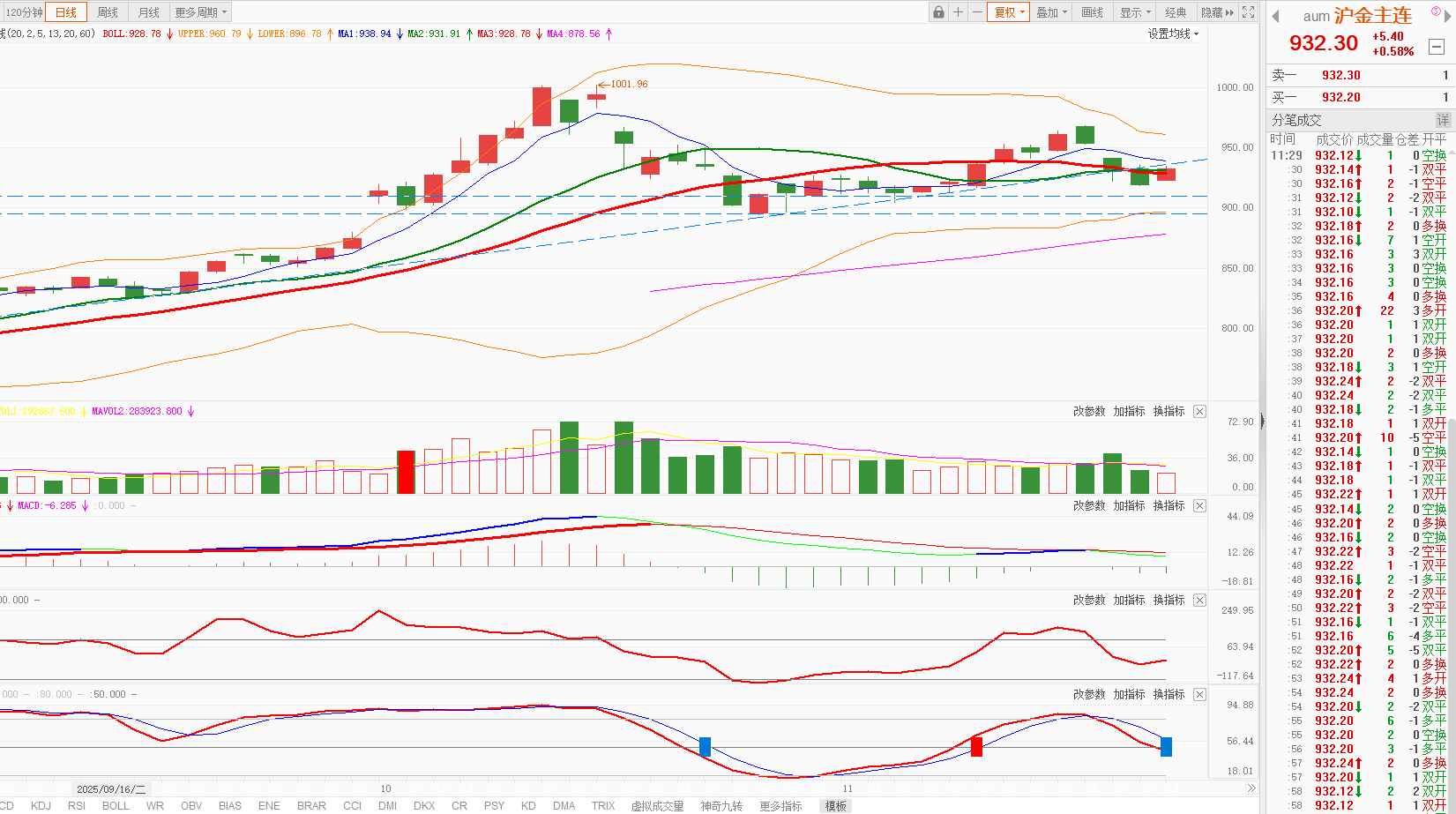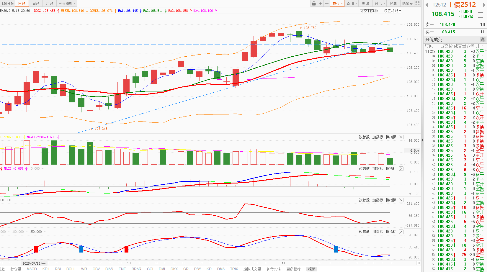 今天国债期货日K线收盘后全部在5日均线之下,整体走势较弱。