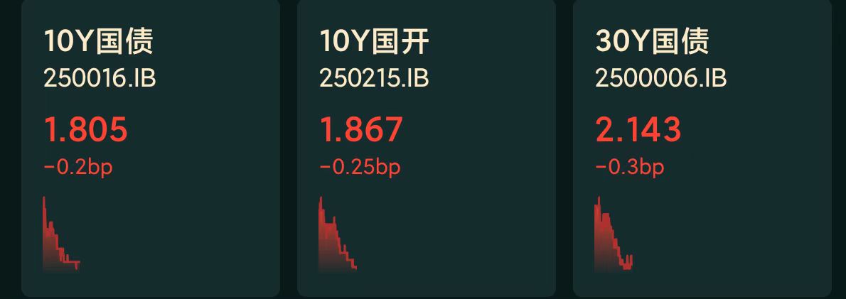 十年期国债收益率:1.805%,-0.2BP(国债收益率越跌,债市越涨)