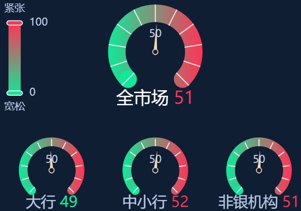 五、资金面情绪指数:全市场51 资金面紧平衡 (0-100紧张度递增,50为均衡,超过50反映资金紧张)