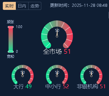 DR001报1.28%左右,DR007报1.40%左右,资金情绪均衡偏松(CNEX资金面情绪指数在51)