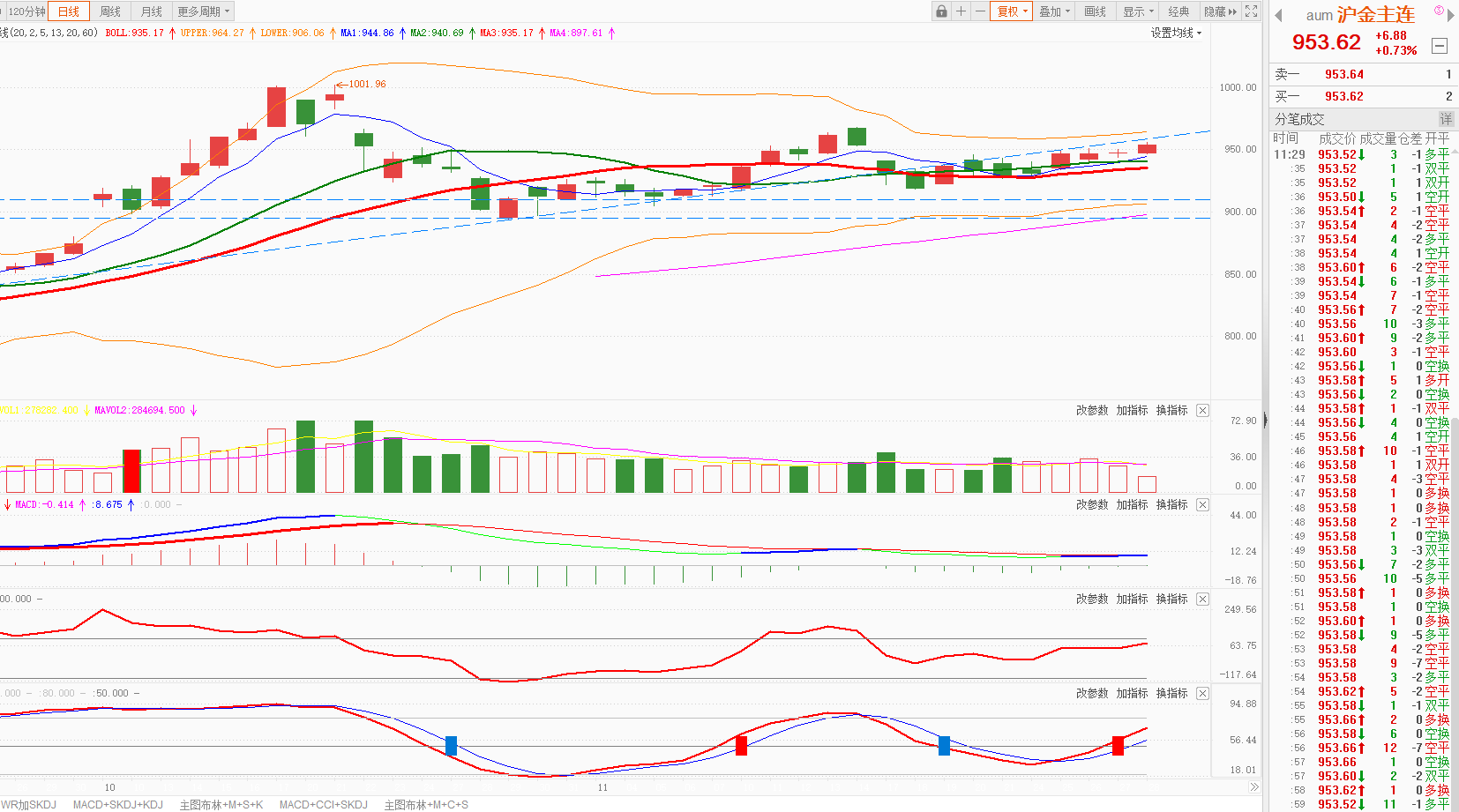 沪金主连:涨0.73%,日K线在5日均线之上。今天沪金上涨,5日均线开始上穿10日均线,趋势向好,目前仍保持小幅上升走势,后市可能继续上行挑战前高。