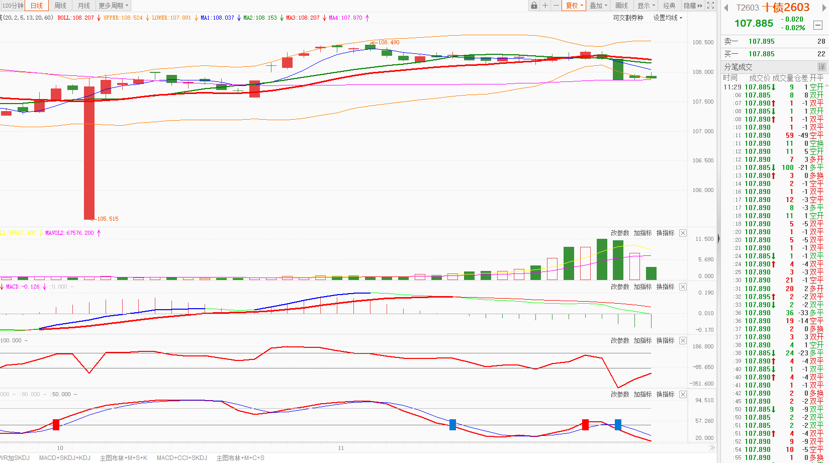 今天10年国债期货高开后冲高回落,跌0.02%,日K线在5日均线之下。