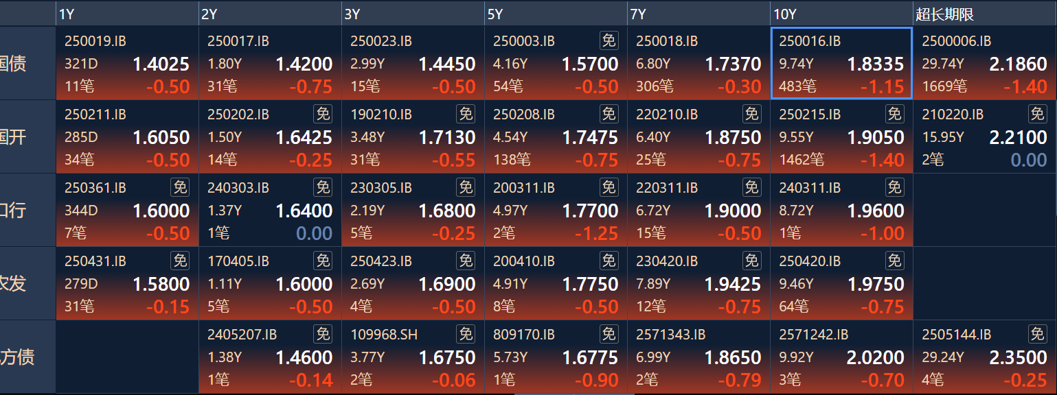 二、十年期国债收益率:1.8335 -0.0115%(国债收益率越涨,债市越跌,两者反向关系)