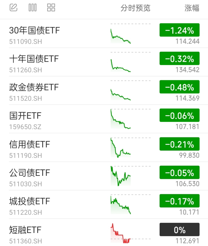 信用债ETF、公司债ETF、城投债ETF,代表信用债基。全部下跌