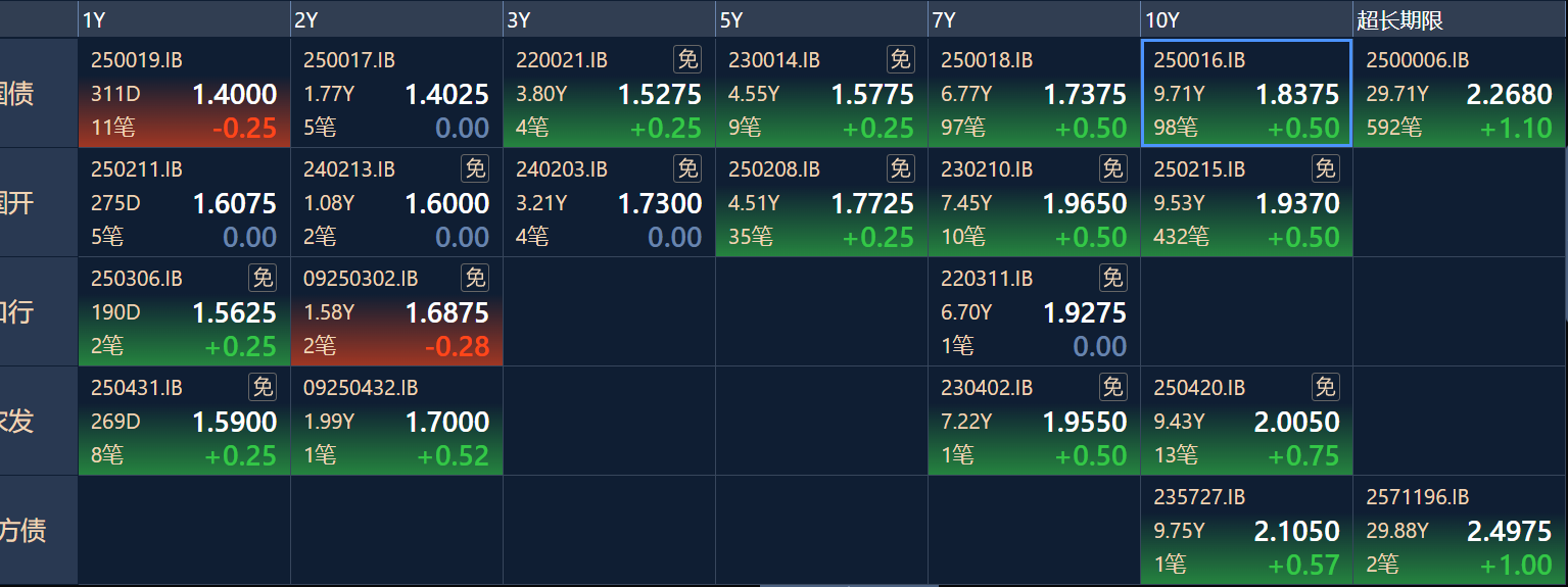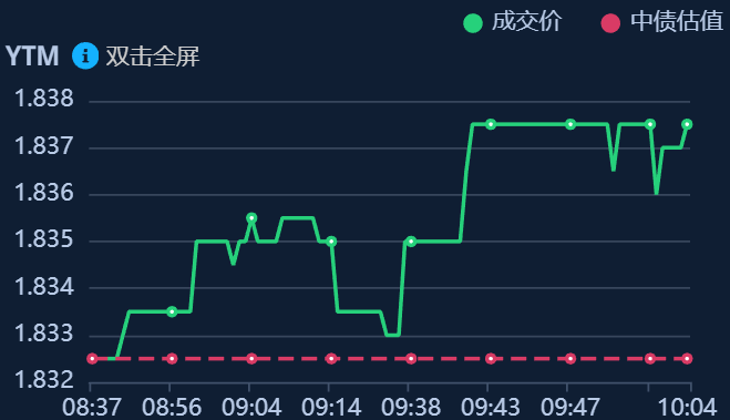 二、十年期国债收益率:1.8375 0.005%(国债收益率越涨,债市越跌,两者反向关系)