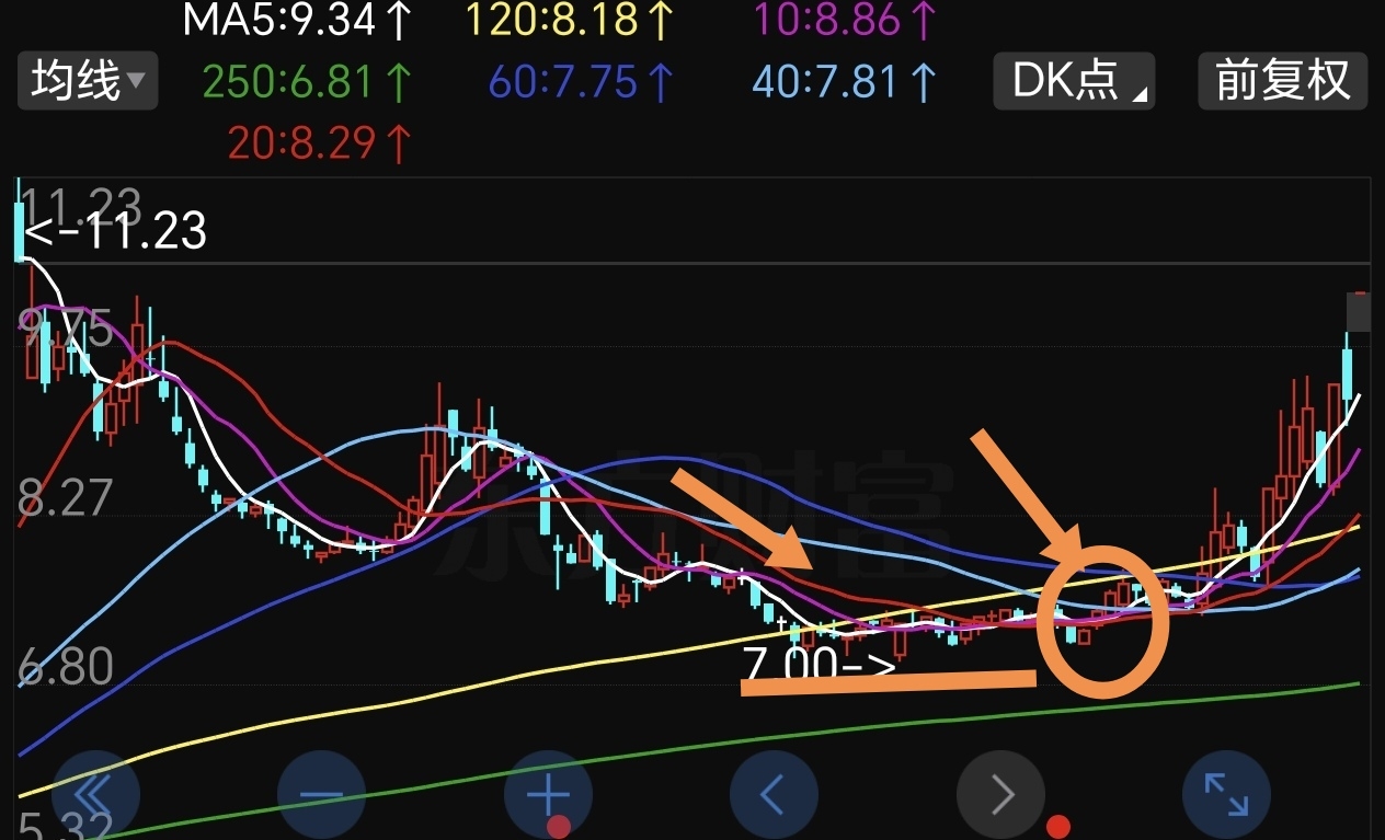 以此图为例,止跌需要下跌角度放缓,进入直线区域平行震荡,然后圆圈里那个低点不再新低,高点越来越高,而圆圈后面的那些回踩绿K就是上车机会。