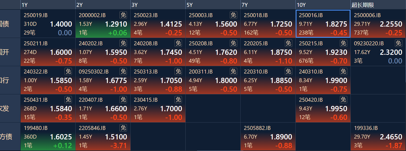 二、十年期国债收益率:1.8275 -0.0045%(国债收益率越涨,债市越跌,两者反向关系)