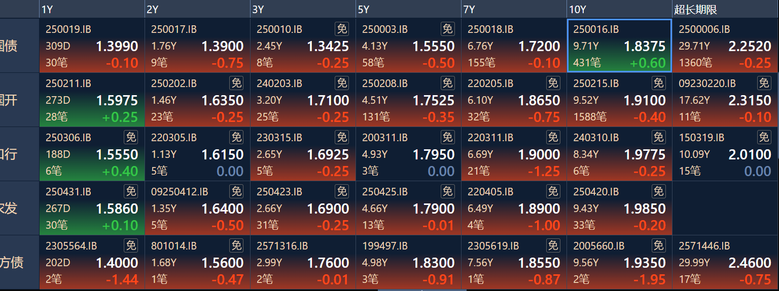 二、十年期国债收益率:1.8375 0.006%(国债收益率越涨,债市越跌,两者反向关系)