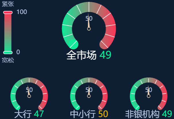 五、资金面情绪指数:全市场49 资金面维稳 (0-100紧张度递增,50为均衡,超过50反映资金紧张)