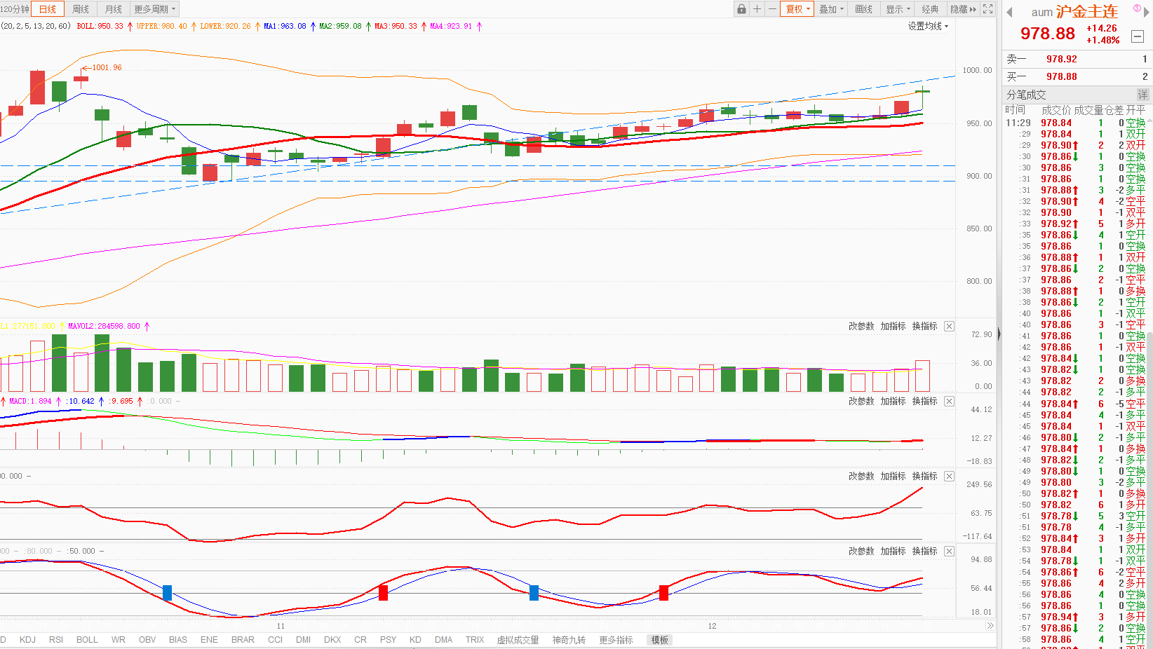 沪金主连:涨1.48%,日K线在5日均线之上。今天沪金继续上涨,日K 线盘中探低5日均线后回升,目前处于小幅上升走势,MACD、KDJ双金叉,后市可能继续震荡上行。