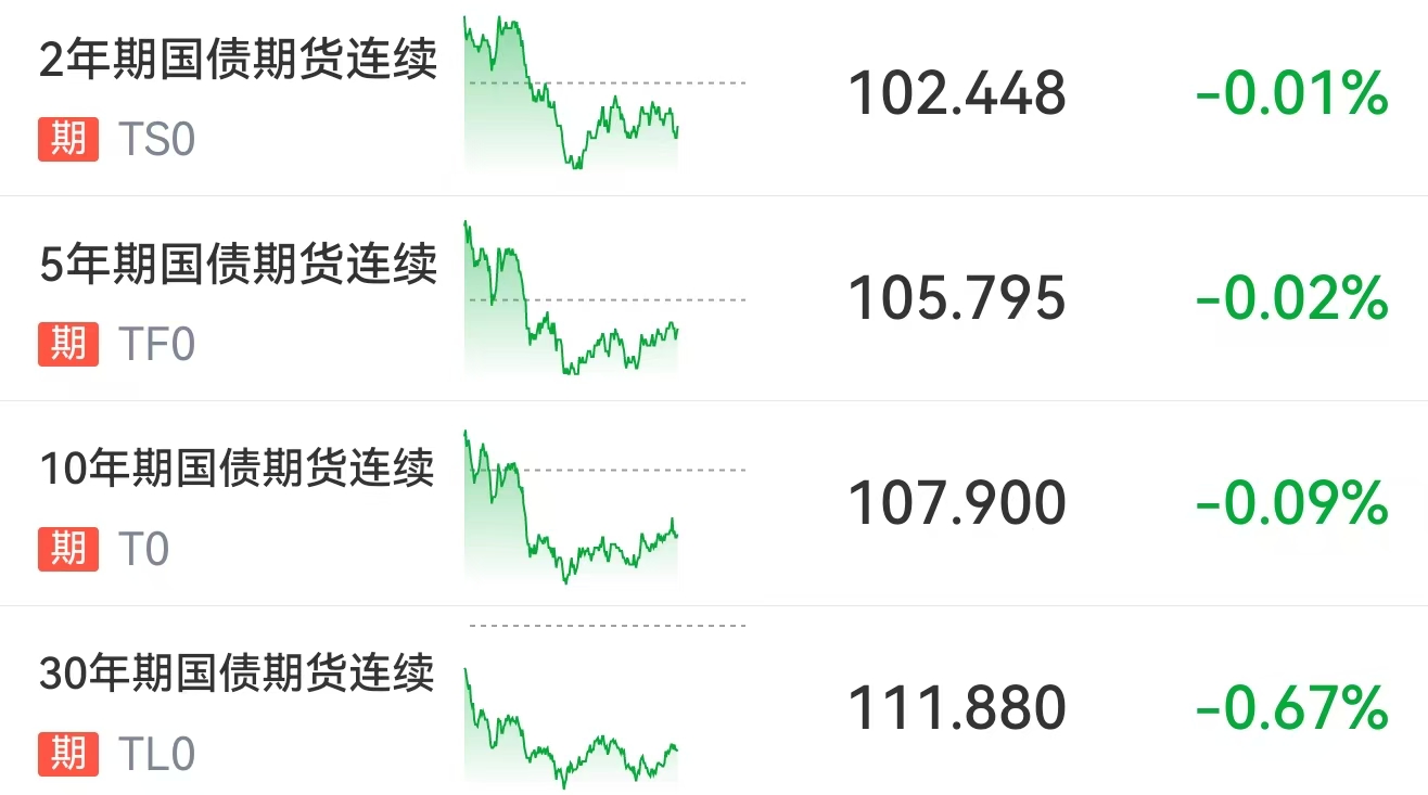 一、国债期货:-0.097%(反映市场对未来债市预期,国债期货越涨,债市越涨,两者正向关系)