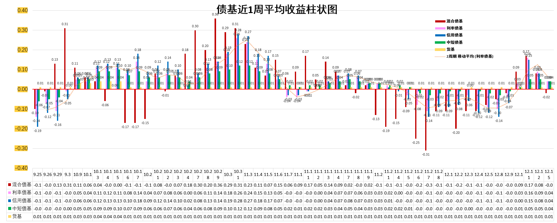 3、近1周平均收益排序:中短债基=信用债基=利率债基>货基>混合债基。