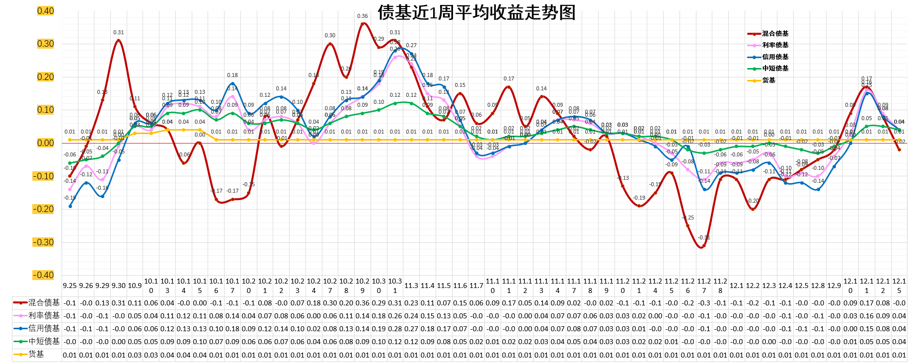2、混合债基近1周平均收益低于货基,低于利率债基。利率债基近1周平均收益与信用债基持平。