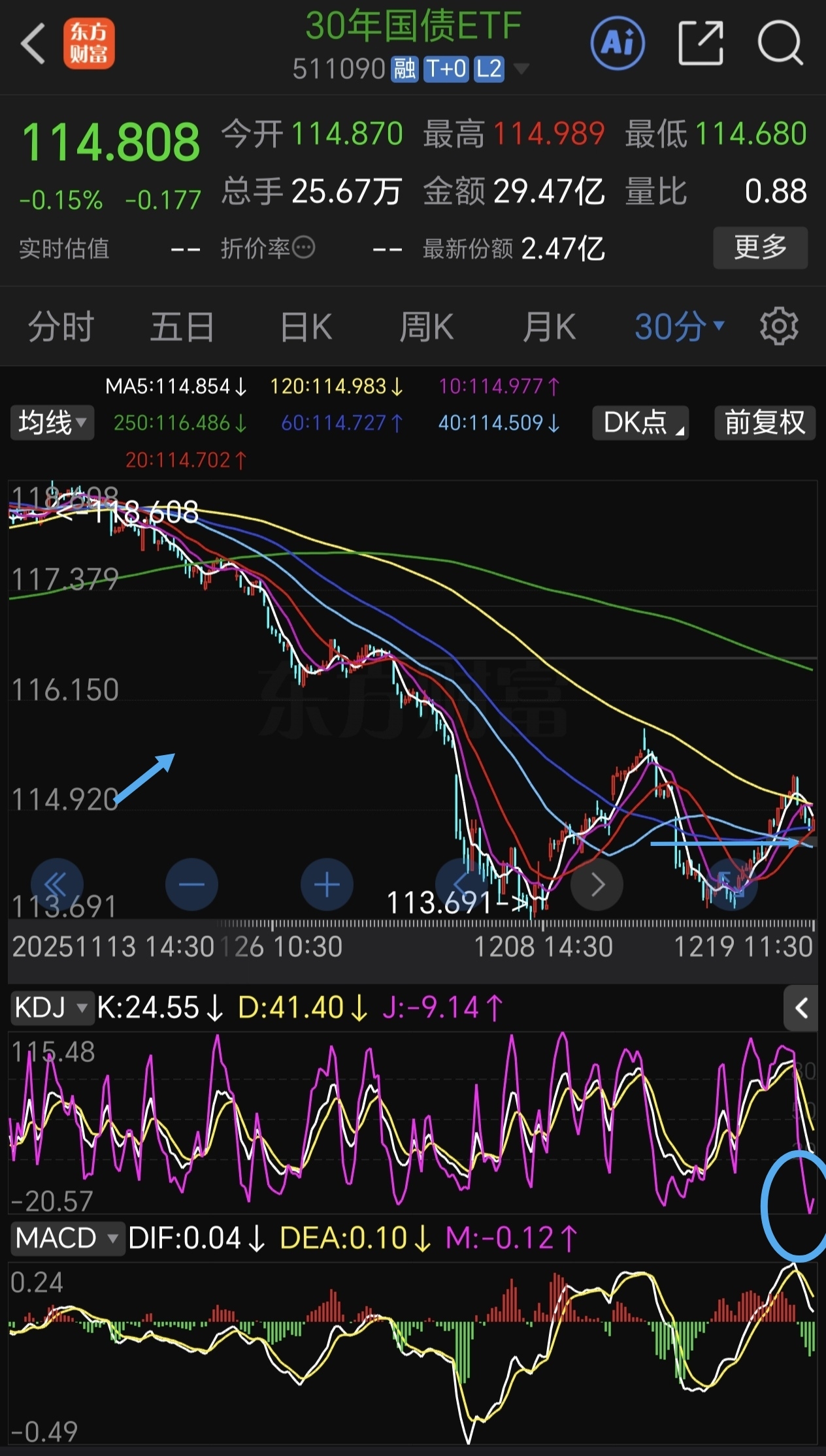 $30年国债ETF(SH511090)$ KDJ三十分钟打到低位,跌速幅度都温和,不用老是一惊一乍,跌了就跑,涨了就追的,目前我个人觉得像之前那种大阴线恐慌已经好一段落了,下面就是自身走它该走的走势,短时间来看就那个箭头位置缺口应该就差不多到位后继续上涨去挑战新高了,债市天天跌不是好事,天天涨更不是好事情,因为跌会造成恐慌无脑抛售,涨会导致跟风资金和短期获利资金抛压,反而进三退二的慢节奏才是好事