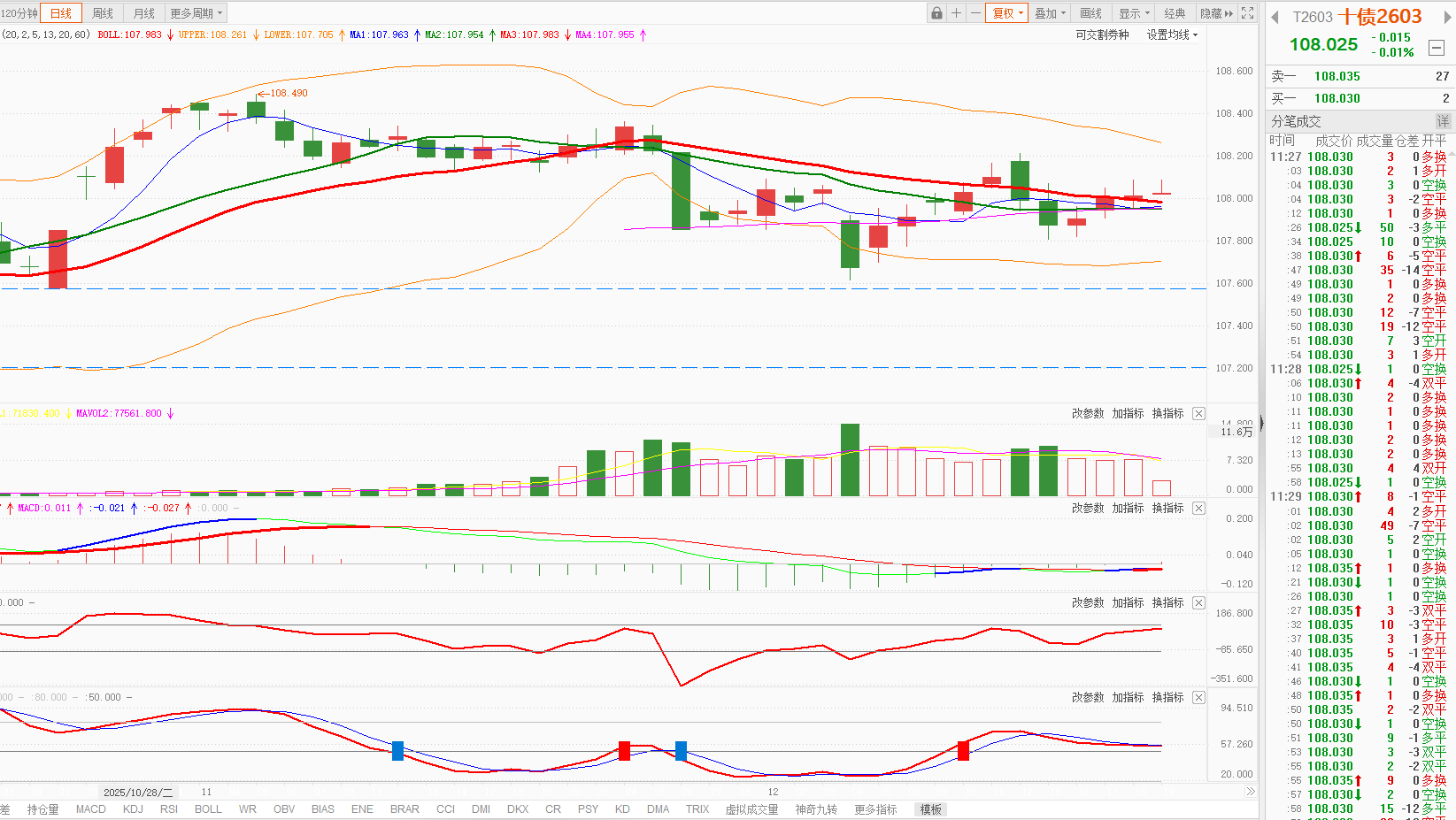 今天国债期货日K线收盘后全部在5日均线之上,整体走势震荡偏强。