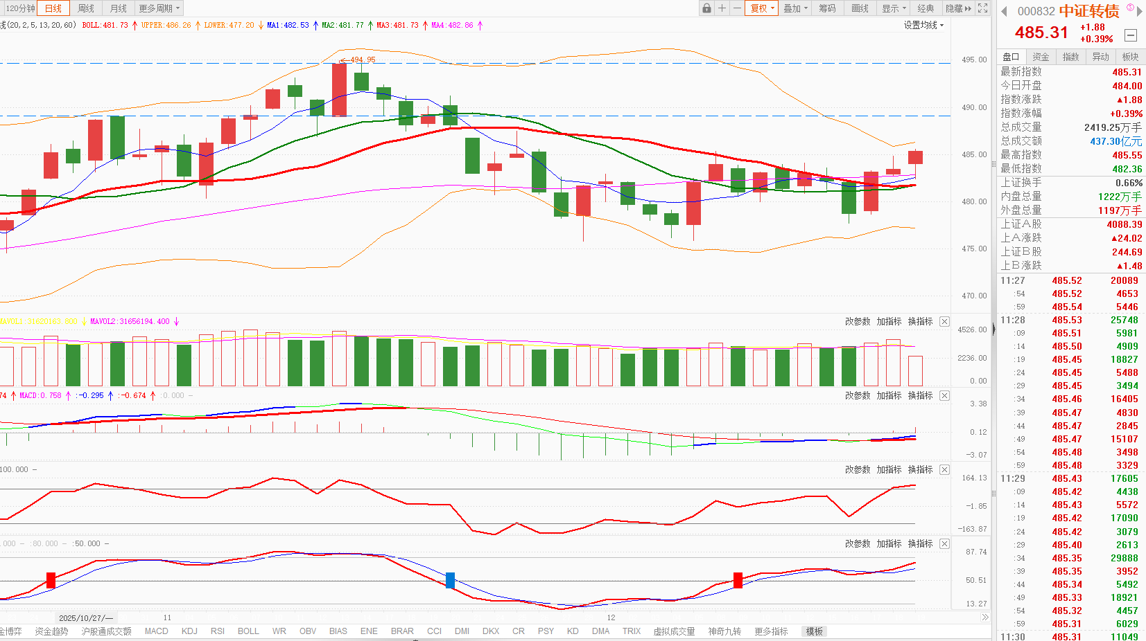 中证转债:涨0.39%,日K线在5日均线之上,KDJ金叉,MACD金叉红柱放大。今天中证转债上涨,盘中冲破前期高点,目前处于区间震荡偏强状态,走势还是不错的,今天如能动作大一点,后市有可能突破前高,再上一个台阶。