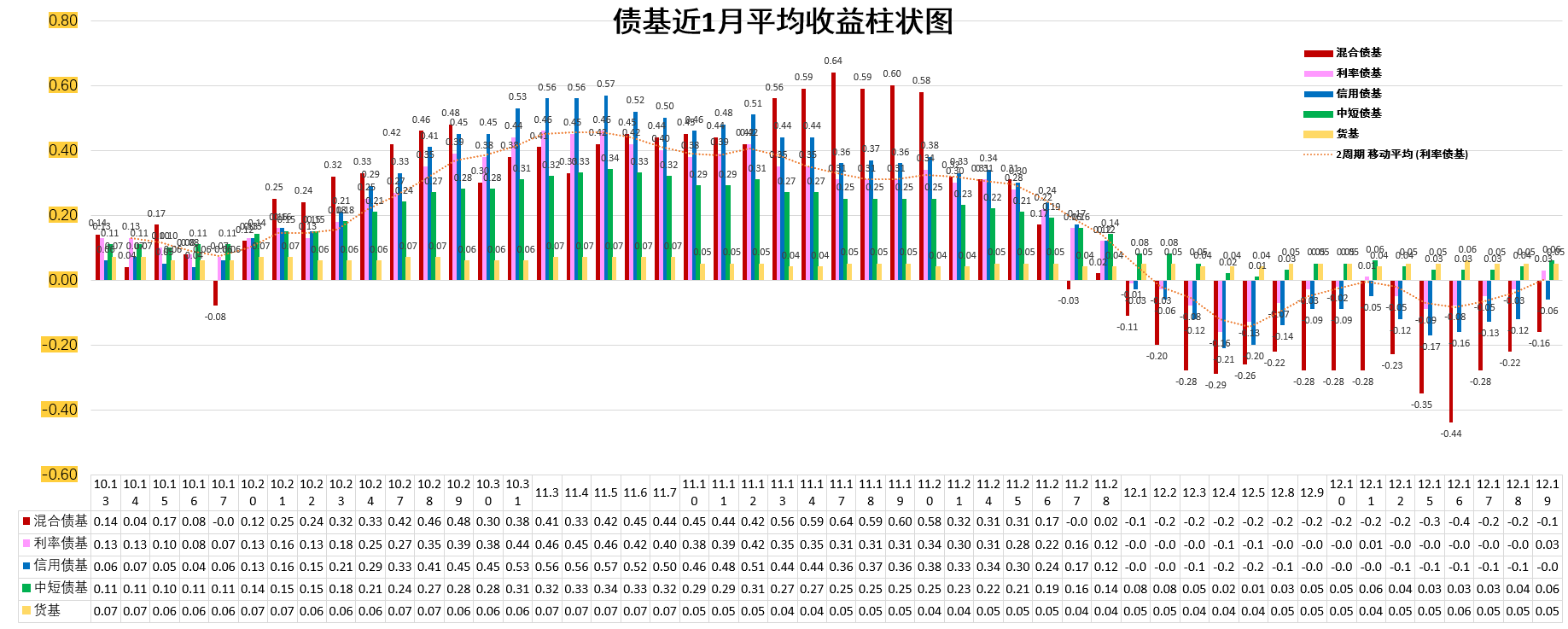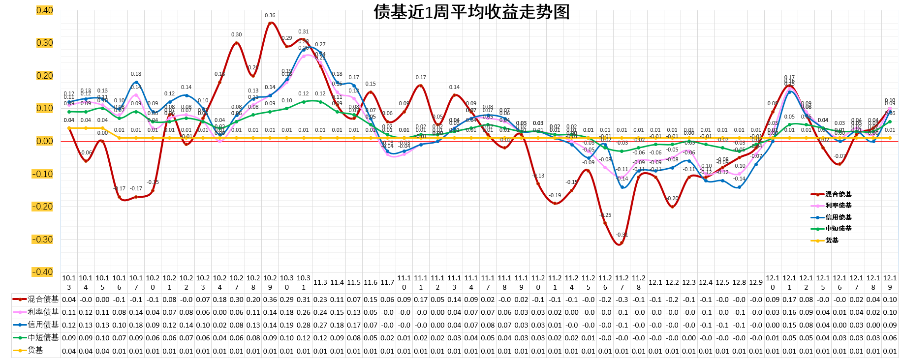 2、混合债基近1周平均收益高于货基,高于信用、中短债基。利率债基近1周平均收益高于信用债基。