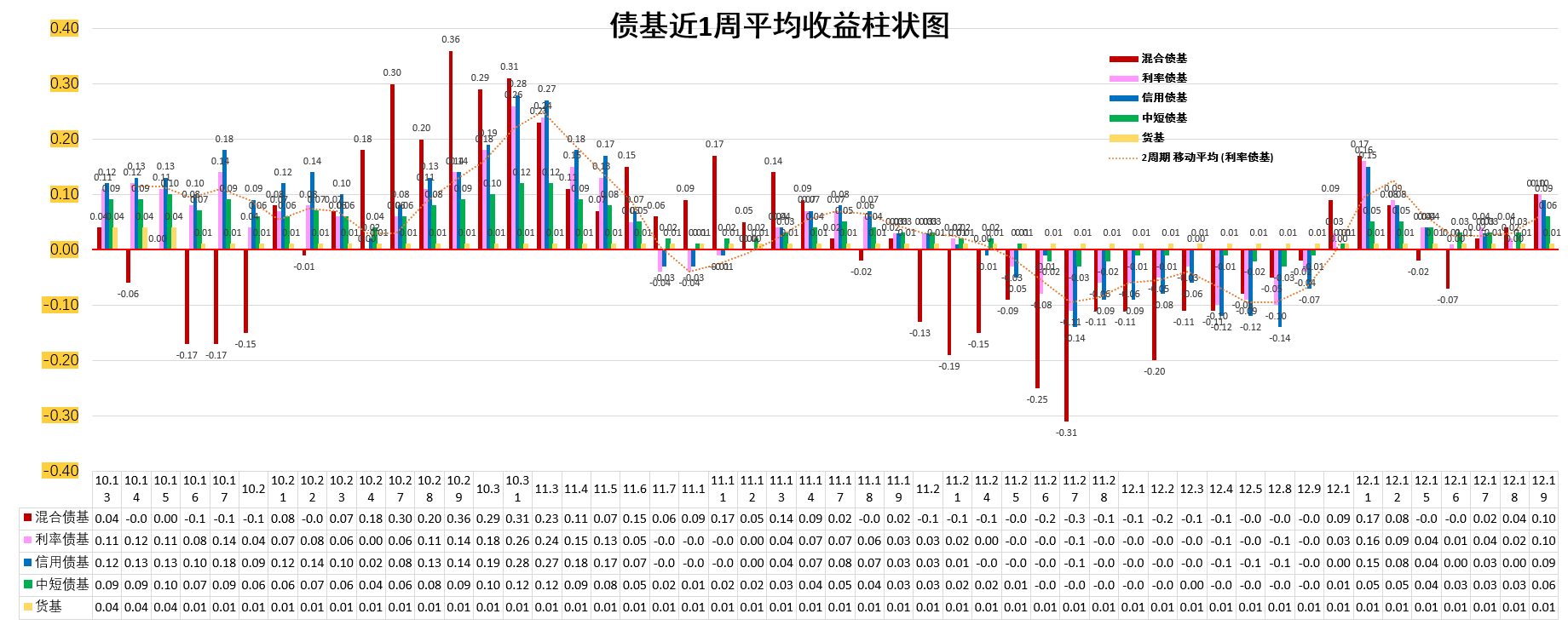 3、近1周平均收益排序:利率债基=混合债基>信用债基>中短债基>货基。