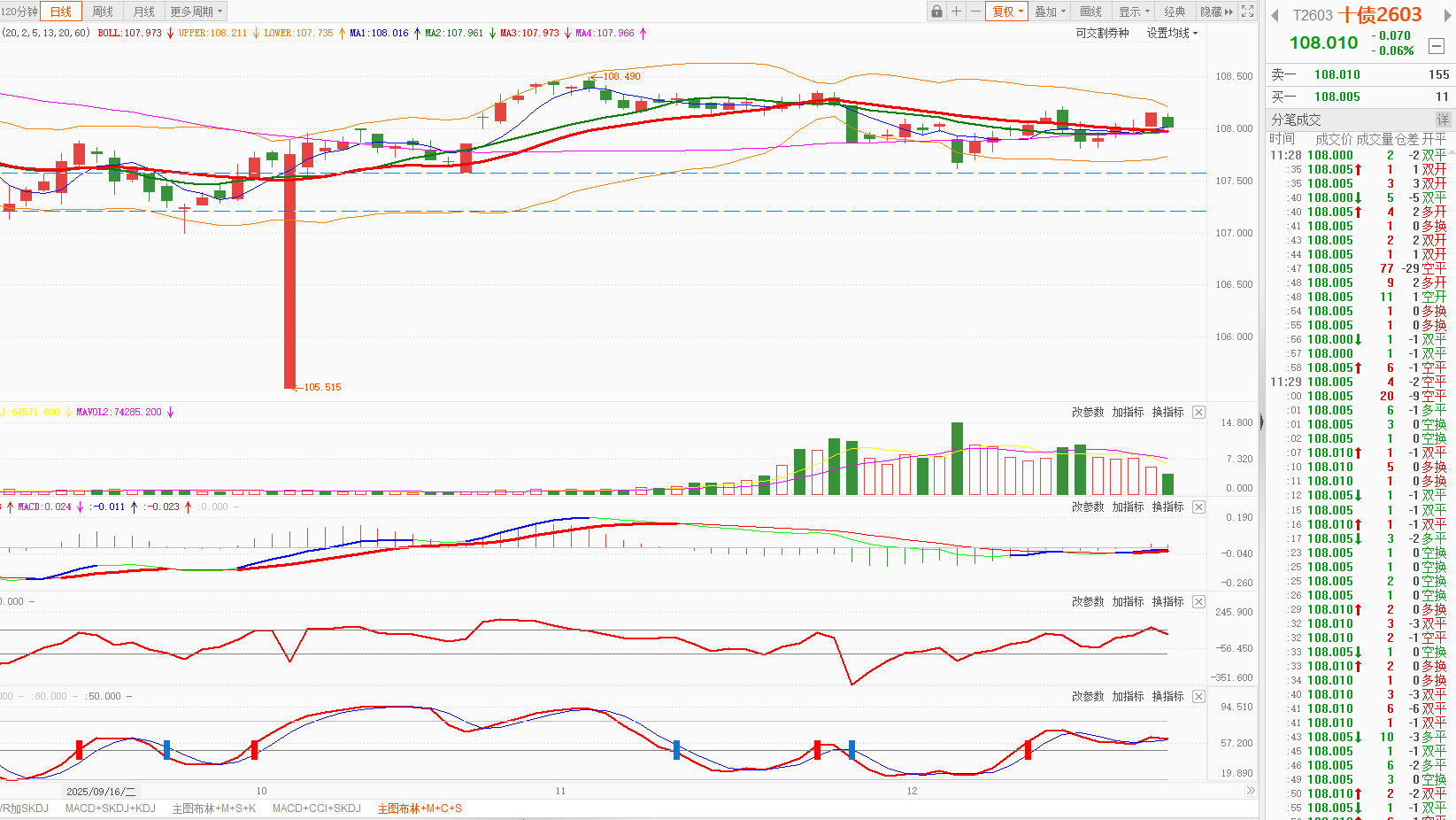 今天10年国债期货小幅高开后横盘下行,跌0.06%,日K线在5日均线之下。