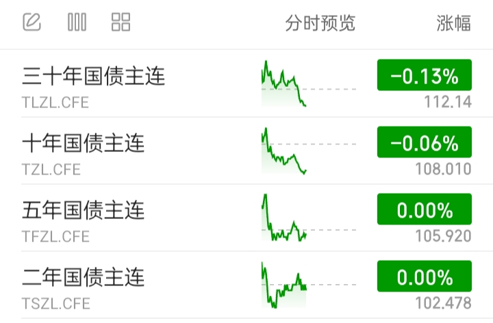 今天2、5、30年国债期货日K线收盘后在5日均线之上,10年国债期货日K线收盘后在5日均线之下附近,整体走势震荡偏弱。