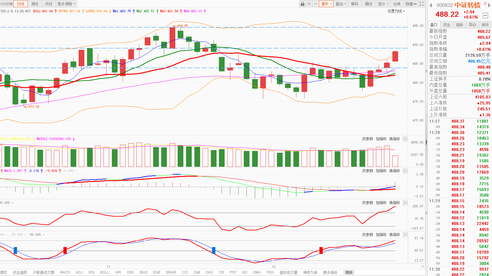 中证转债:涨0.61%,日K线在5日均线之上,KDJ金叉,MACD金叉红柱放大。今天中证转债继续上涨,已完全突破原震荡区间上轨和前高,再上一个台阶。5日均向上,布林线开口张大,后市可能继续震荡上行。