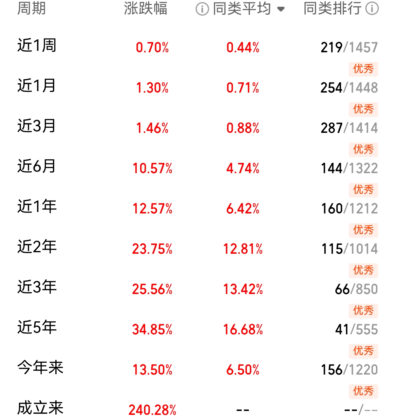 该基金自2006年成立以来累计回报达240.28%,年均收益率约12.64%,中长期超额收益显著。近一年收益率12.57%,最大回撤仅4.72%,只35天就修复了,妥妥的能涨抗跌。