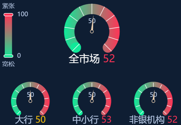 五、资金面情绪指数:全市场52 资金面紧平衡 (0-100紧张度递增,50为均衡,超过50反映资金紧张)