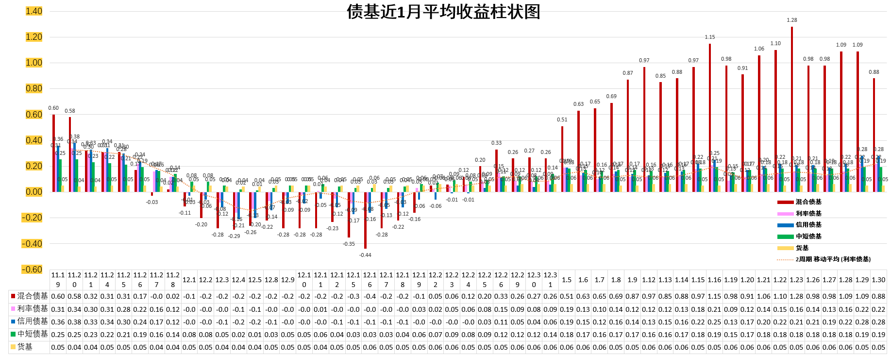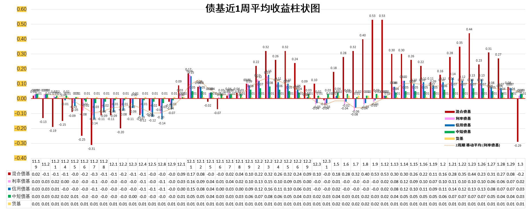 3、近1周平均收益排序:中短债基=信用债基>利率债基>货基>混合债基。