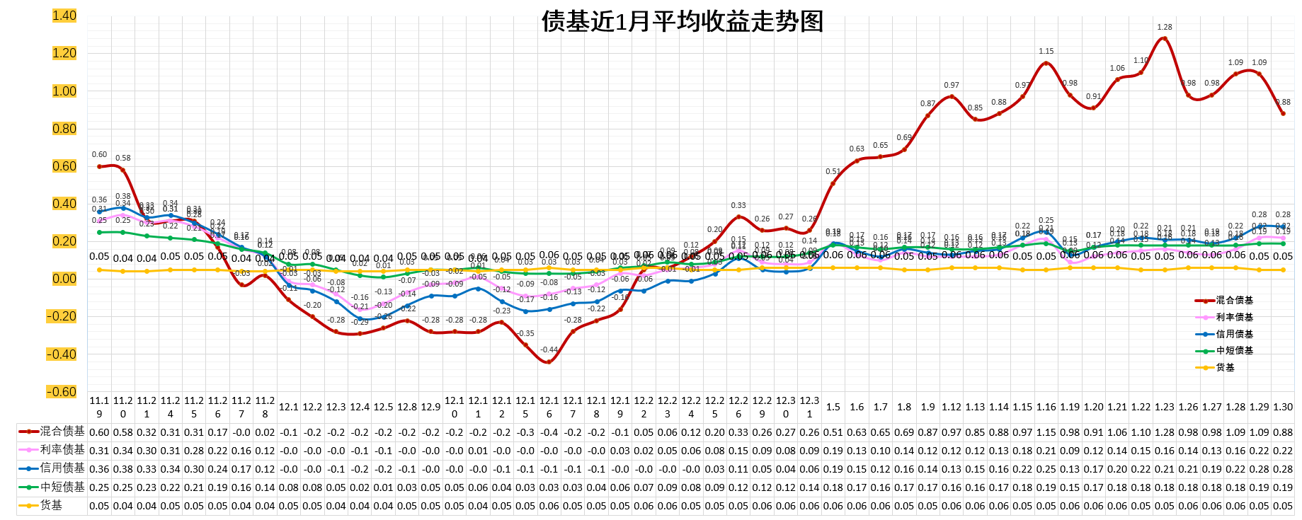 四、债基近1月平均收益走势图
