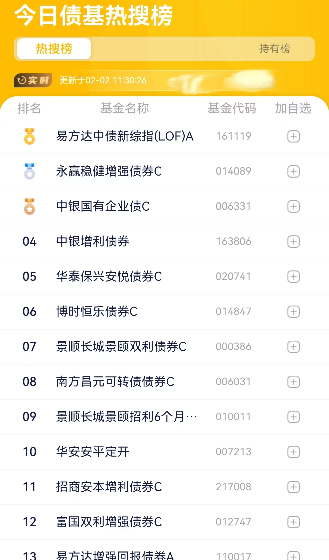 截止11点20分,华子收2个,南方中债收2个,方正富邦鸿远碎35-45个,富国优化增强碎80-90个,中邮恒利碎45-55个,鹏华双债碎45-55个,博时恒乐碎25-35个,永赢稳健碎70-80个,最终数据已17点收盘为准。