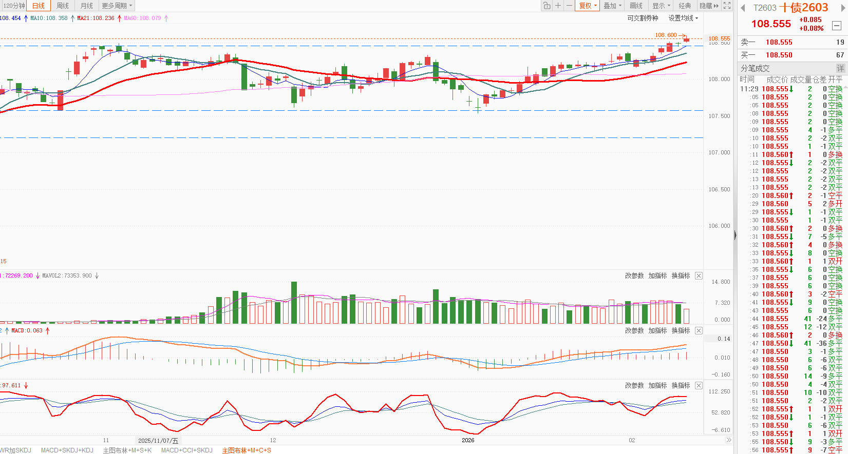 今天国债期货日K线收盘后全部在5日均线之上,整体走势震荡偏强。2年国债期货走势偏弱,又在闹娥子。
