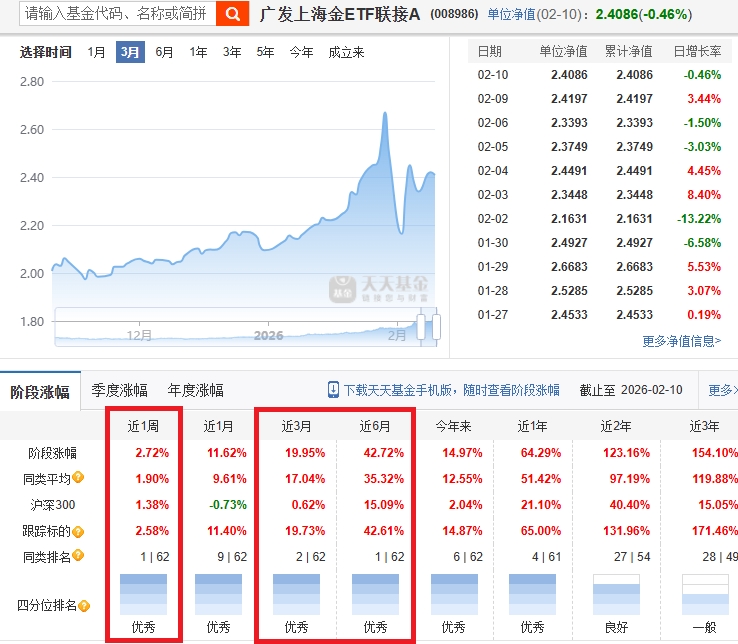 广发上海金ETF联接C近1周涨幅2.71%,近6月涨幅42.47,近1年涨幅达63.71%, A、C、F类排名包揽同类前三,业绩表现非常不错,为防止节日期间外盘趁机拉抬造成踏空,司机今天先加一笔,后面再看情况。