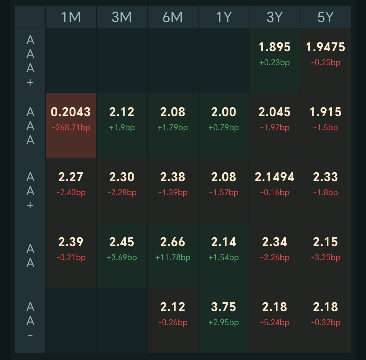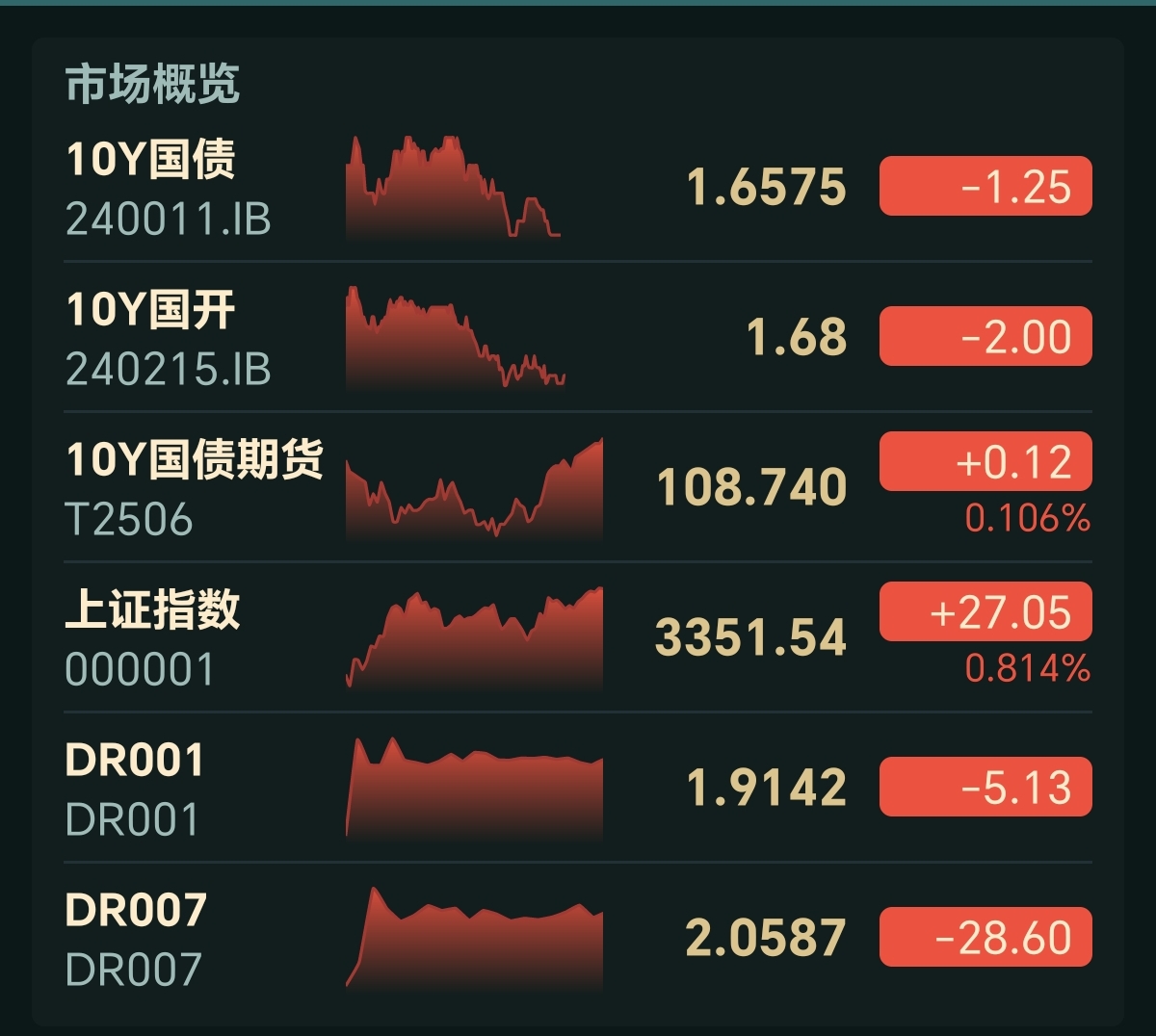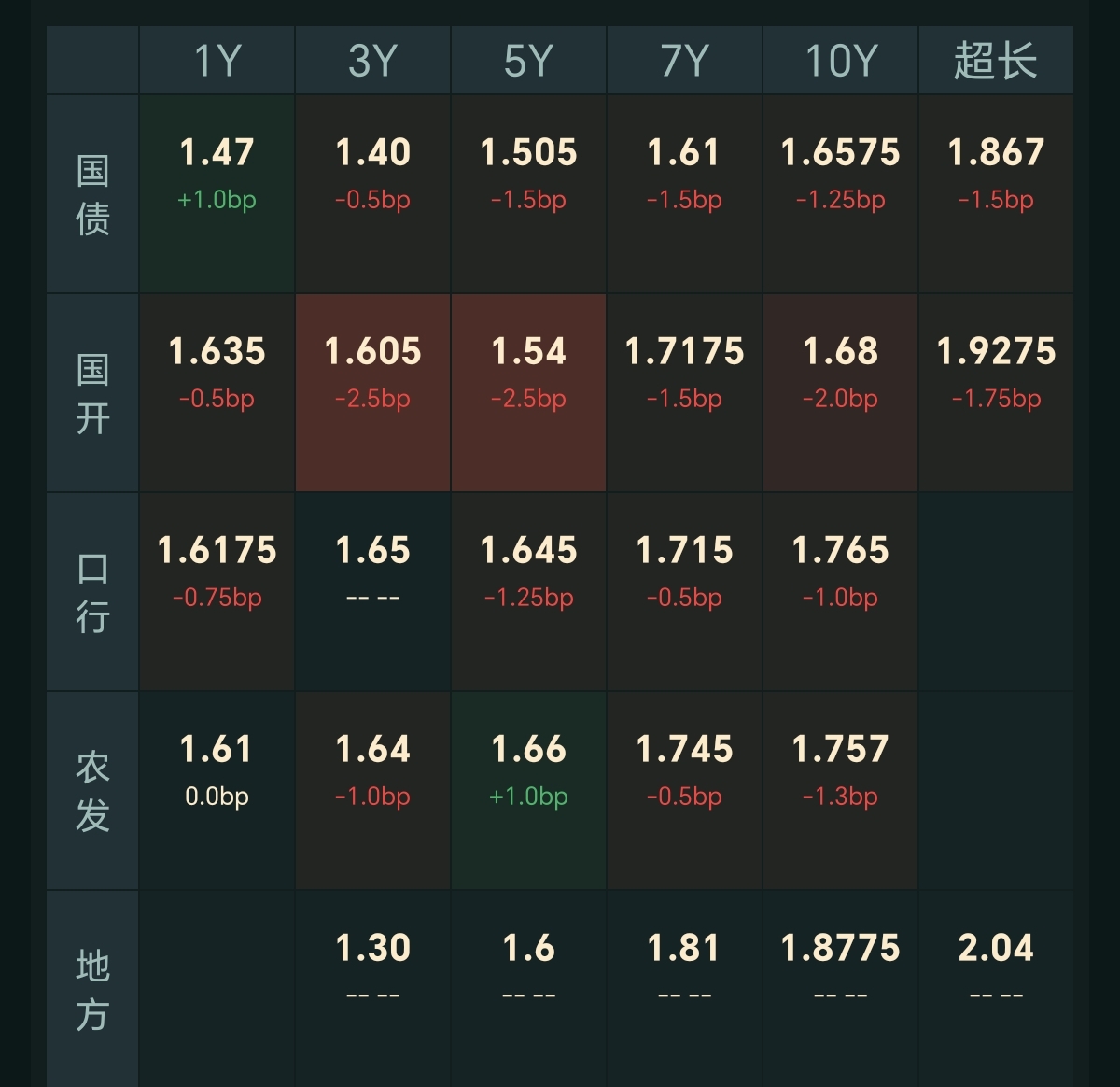 10年国债收益率下行1.25BP至1.6575%,利率债晴天,信用债多云,同业存单多云。