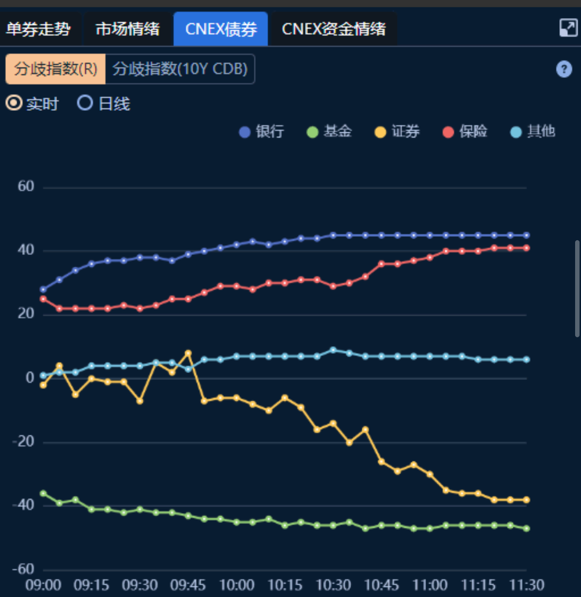 今日沪指刷新近十年新高叠加资金面大幅收紧,银行间主要利率债收益率全线大幅上行,中长端活跃券收益率上行至阶段性高点,债市空头情绪主导。债券分歧指数来看,基金为早间卖方主力,证券卖盘力量逐步增强,配置盘为主要承接力量。