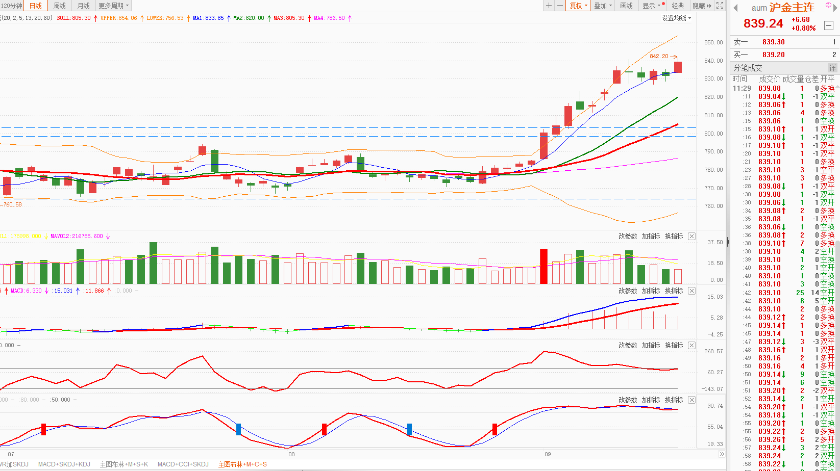 沪金主连:涨0.80%,日K线在5日均线之上。今天沪金大涨,盘中再创新高,有可能突破了近期的小幅震荡区间,后市可能会继续向上,持仓观望或适量跟进。