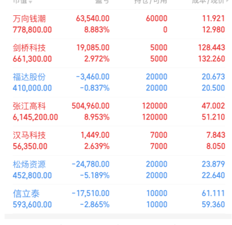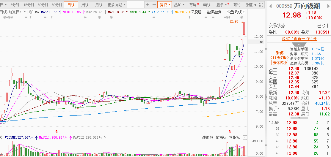 万向钱潮:汽车零部件+固态电池+机器人。今天平开震荡后快速涨停,实现11天7板,早盘竞价涨幅不高,有足够的上车机会,开盘前留言提了,恭喜吃肉,目前放量涨停,再创新高,上涨趋势延续。