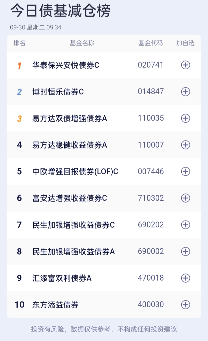 $鹏华丰禄债券(OTCFUND|003547)$。$华泰保兴安悦债券C(OTCFUND|020741)$。$南方中债7-10年国开行债券指数A(OTCFUND|006961)$。$永赢鑫欣混合C(OTCFUND|018603)$。$富国优化增强债券E(OTCFUND|018980)$。$中邮纯债恒利债券C(OTCFUND|002277)$。$方正富邦鸿远债券C(OTCFUND|015909)$。$东方添益债券(OTCFUND|400030)$。$国泰嘉睿纯债债券C(OTCFUND|016604)$。$长城短债C(OTCFUND|007195)$