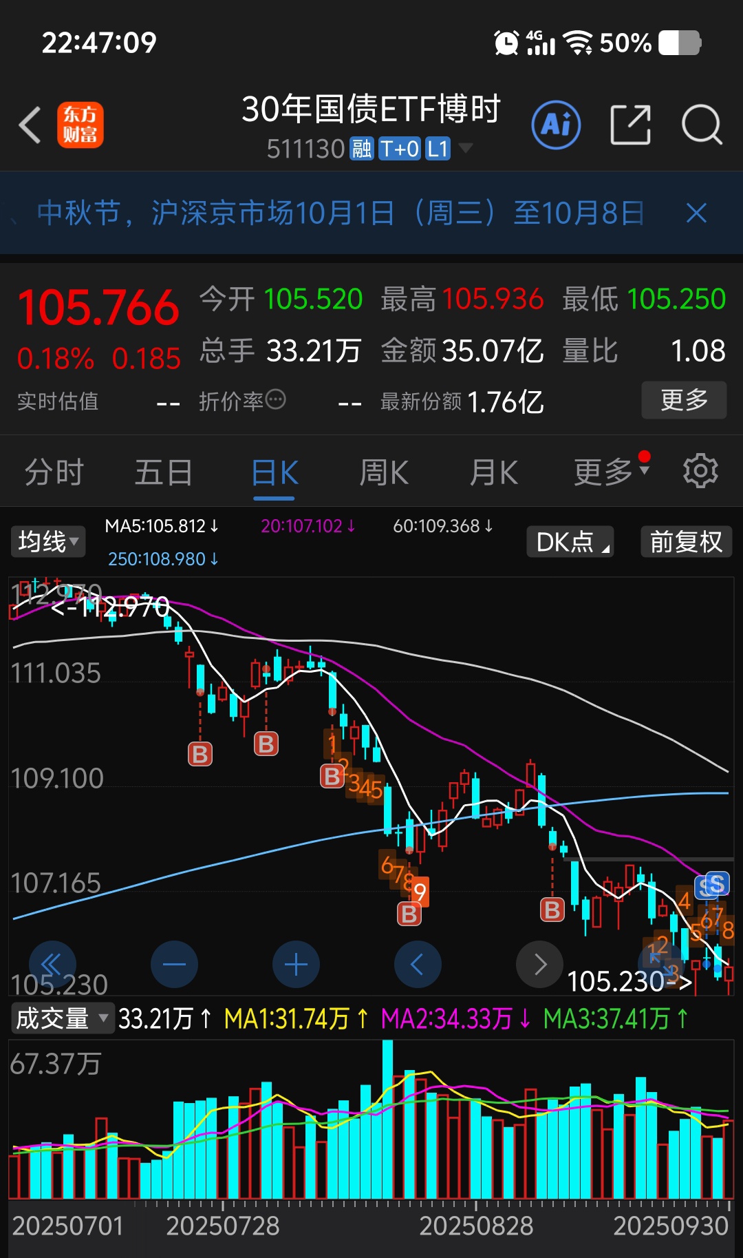 $30年国债ETF博时(SH511130)$ 是不是高买低卖,之后他就起飞了?50年都长期破发了。