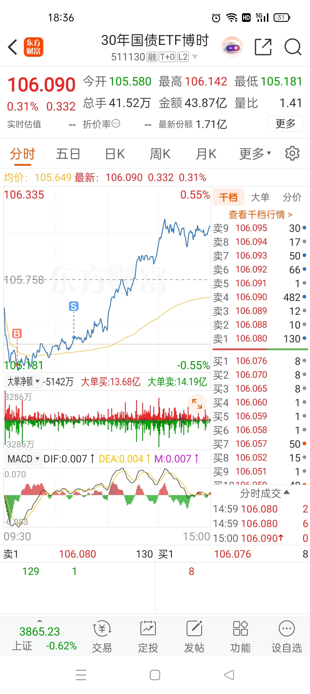 $30年国债ETF博时(SH511130)$ 早上买点完美,就是卖太早了,卖了出去接盘恒升科技电池亏安逸了