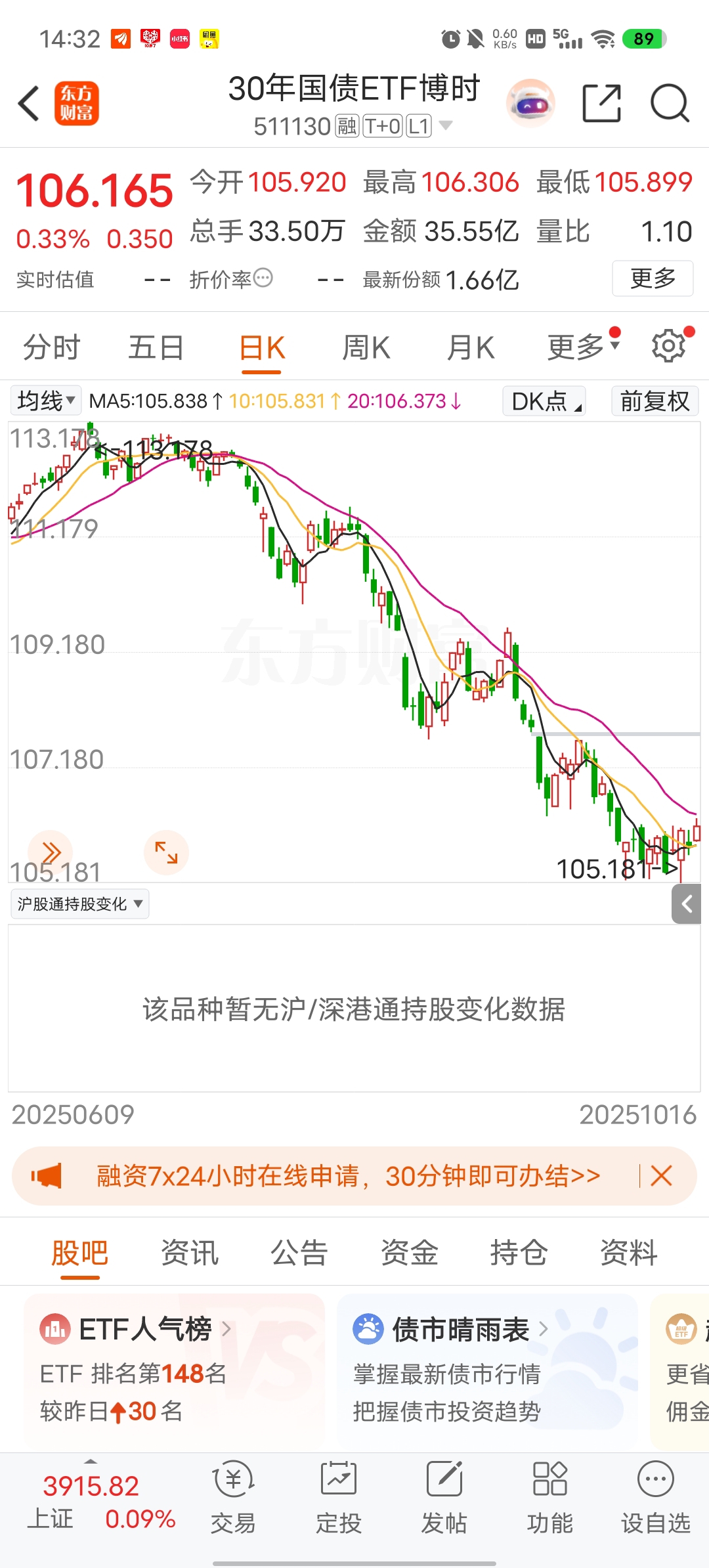 $30年国债ETF博时(SH511130)$ 调整了这么久,总算见点阳光了。