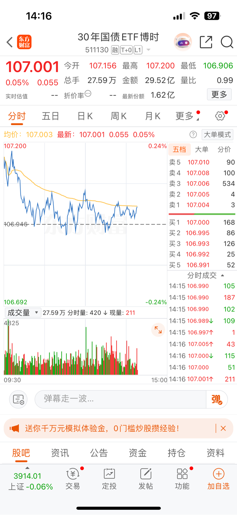 $30年国债ETF博时(SH511130)$ 央行放水,利好债市,这波跟对了