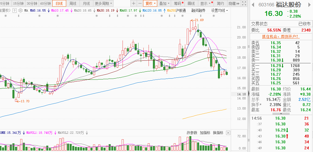 福达股份:汽车零部件,今天继续在16上方横盘弱势震荡,虽然小跌收小阴线,没有站上半年线的支撑上方,但下方16不破还是处于横盘筑底过程,在等等创新低就走。