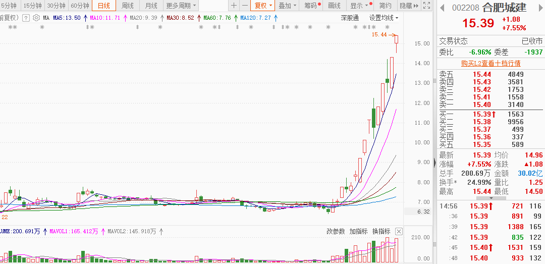 合肥城建:房地产开发+光伏,今天高开震荡后尾盘向上拉升,收涨7.5%左右,光头阳线,创新高,放量上涨,虽然没有涨停,但向上拉升力度得到转强,继续向上冲锋中还有空间。