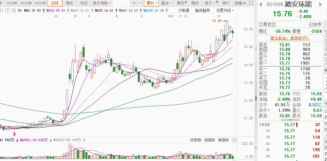 潞安环能:煤炭开采,天气往后只会越来越冷,对煤炭需求会持续增加,今天潞安虽然没有延续向上冲锋拉升,但也没有调整大幅度跳水,维持正常的波动,10均线支撑依然不破向上运行,看周四能否跟随支撑向上反包延续震荡反弹趋势。
