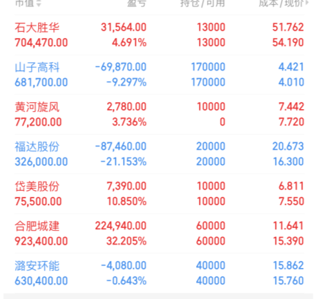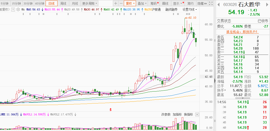 石大胜华:锂电池,今天平开低走,随后一直在低位弱势震荡,该股我们有先手,加上早盘低走后没有进一步创新低,尾盘还有所回升,收下影线的阴线,下跌减弱,看周四能否反包回去,不然我们也只能落袋了。