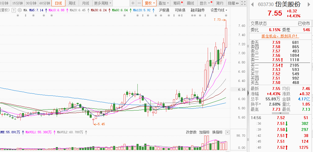 岱美股份:汽车零部件,今天小幅度低开随后5均线支撑企稳开始震荡反弹。一路高歌猛进,最高冲到5.6%左右,收盘收涨4.4%上涨得到加强,股价突破近期7.2的小高点,上涨加速,放量拉升,继续维持向上的震荡反弹趋势,看周四能否继续向上溢价。